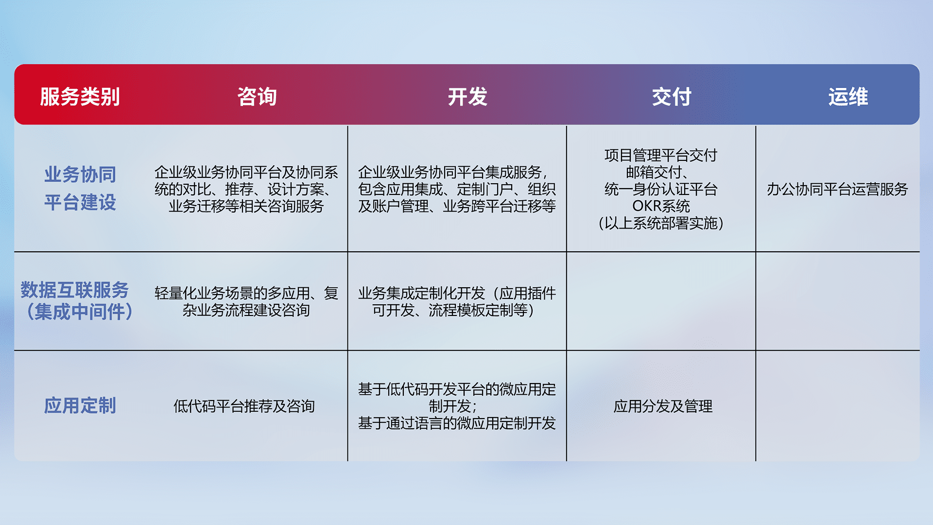 针对钉钉、、企微、、IDaas等平台级产品提供产品的规划、、、、方案、、交付、、、定制化开发等服务,,,,实现如统一协同办公、、智能客户服务、、混合会议管理、、、智能数据查询、、等业务场景,,,,实现数字化转型。。。。
